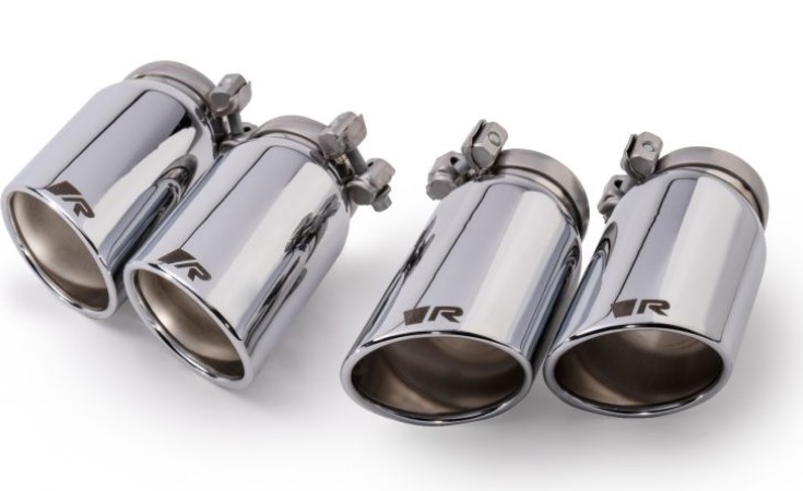 Nerezová sada koncovek 4 výfukové koncovky Ø 84 mm zkosená/zkosená, válcovaný okraj, chromovaná. MOŽNOST ZMĚNIT DESIGN - má nastavitelnou spojovací sponu pro případné vysunutí / zasunutí a rovněž i změnu sklonu! UNIKÁTNÍ ŘEŠENÍ REMUS pro Vaši individualizaci.