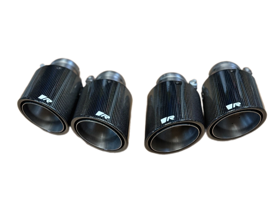 4 ks KARBONOVÝCH koncovek Ø 102 mm, se šikmým řezem. Celá nosná konstrukce je z TITANU. Hmotnost jedné koncovky je tak pouhých 190 gramů! Logo REMUS je zde ve zkrácené podobně "R". Jde o nejluxusnější provedení, které posune vzhled každého vozu na úplně jinou úroveň. Možnost regulace polohy v podélném směru i sklonu pomocí sférické spony. Unikátní řešení pro vaši individualizaci finálního vzhledu.
